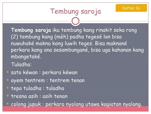 Langsung wae ing ngisor iki penjelasane. Negeri padhangklana iku, rakyate ayem tentem , alame ijo royo royo tur rajane adil lan mangerteni. Bisa uga artiné perkara kang ana sesambungane, bisa uga kahanan kang mbangetaké. Ing ngisor iki tuladhane tembung saroja. Bahasa jawa menjadi bahasa yang paling banyak dituturkan oleh masyarakat indonesia setelah bahasa persatuan bahasa indonesia. Basa rinengga yaiku basa kang endah amarga di paesi / di rumpaka. Tembung saroja yaiku tembung loro kang padha tegese utawa meh padha tegese kang lumrah dianggo bebarengan.(terjemahan; Panulise tembung ing ukara ing ngisor iki sing bener. Gawea ukara nganggo tembung saroja. Bisconcat = bias dan oncat; Abang mbranang, nduweni teges yaiku abang banget utawa abang nemen. Tembung saroja yaiku tembung loro utawa luwih sing tegese padha/meh padha digandeng dadi siji kangge mbangetake. Sarana tembung pangiket kang mrateakake kosok balen.