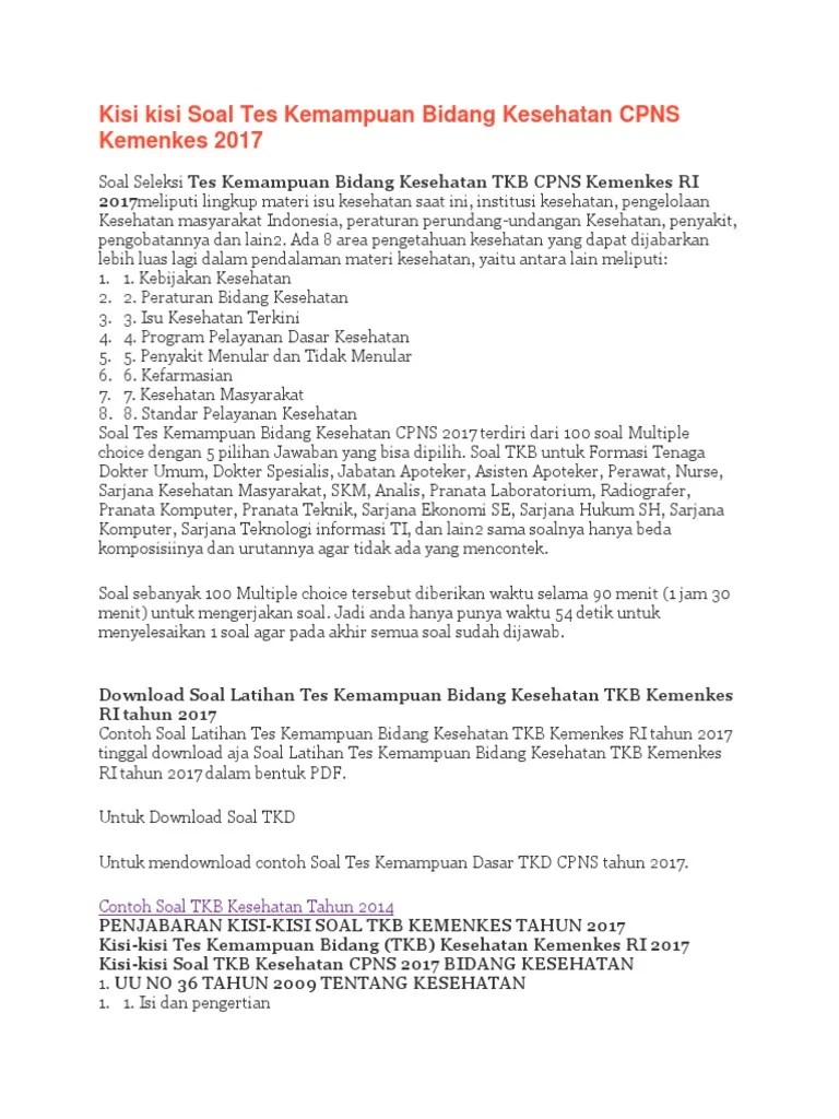 Desember 8, 2018 pukul 7:59 am. Tes kemampuan dasar tkd ujian seleksi cpns kemenkes ri tahun 2017. Skb keguruan kesehatan semua formasi. soal tkb kesehatan 2018 pdf. contoh soal latihan tes kemampuan bidang kesehatan tkb kemenkes ri tahun 2017 tinggal download aja soal latihan tes kemampuan bidang kesehatan tkb kemenkes ri tahun 2017 dalam. soal tkb tes kemampuan bidang dokter ahli pratama, pdf. Jual beli online aman dan nyaman hanya di tokopedia. By icpns posted on april 10 2020. Formasi cpns kementerian kesehatan tahun 2017. Doc soal soal tkb cpns kemenkes doc 1 rizki yuliana. Demikianlah artikel 50 contoh soal pilihan ganda teks iklan beserta jawabannya. Download soal tkb kesehatan pdf secara gratis untu latihan tes skb kesehatan. Berikut beberapa contoh soal dari tes kompetensi bidang kesehatan.